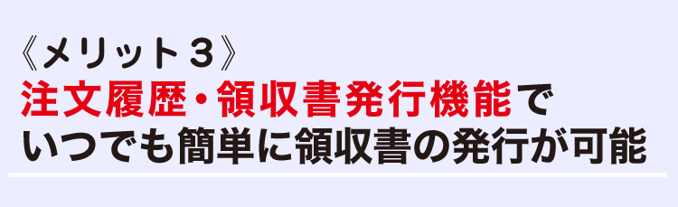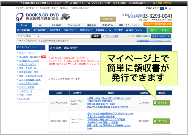 マイページ上で、過去の注文履歴からお問合せいただく事なく、いつでも簡単に領収書が発行できます。
