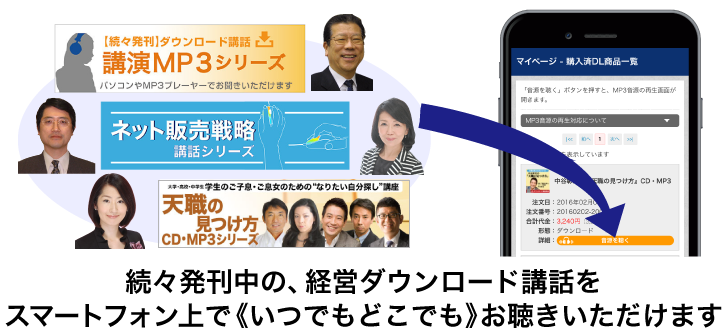 ご購入いただいた経営ダウンロード講話シリーズは、スマートフォンからのマイページへアクセスいただければ、そのままスマートフォン上で講話音声をお聴きいただけます。ちょっとしたスキマ時間、移動時間等に、ぜひご活用ください。