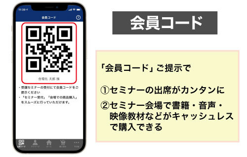 マイページから申込セミナーの詳細確認、会場の行き方もルート検索。アプリに表示される会員コードをセミナー会場でご提示いただくだけで、受付終了(※一部のセミナーはのぞきます)。また、セミナー会場での書籍・音声講座・映像講座なども購入いただけます。キャッシュレスの対応はマイページにクレジットカードのご登録が必要です。