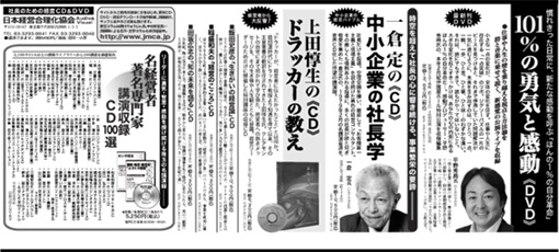 新刊DVD 平野秀典の「101%の勇気と感動」をはじめ、新刊CD 上田惇生の「ドラッカーの教え」CDをはじめ、CD選集シリーズなど…新聞広告にてご案内の名経営者・著名専門家の講演CDは下記から詳細をご覧いただけます。また、一部の商品は、サンプル音声、サンプル映像もご覧いただきます。