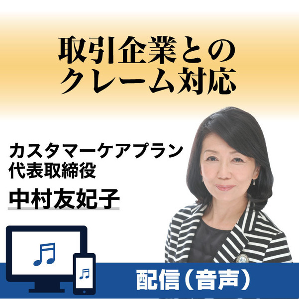 音声・動画 取引先からのクレームへの上手な初期対応法 「取引企業とのクレーム対応」CD・デジタル版 中村友妃子(カスタマーケアプラン代表取締役) 取引先からいただく「クレーム」にどのように対応するべきか。 クレーム対応指導のプロ 中村友妃子が、取引企業からのクレームへの初期対応のやり方と手順を解説。電話対応、訪問対応の基本を演習もまじえ、クレームを大きくしない実務をわかりやすく指導。 …