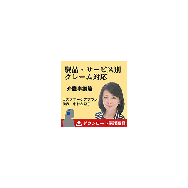 音声・動画 クレーム対応のプロが教える初期対応法 製品・サービス別クレーム対応《介護事業篇》 中村友妃子(カスタマーケアプラン代表取締役) 「介護事業」で起こるクレームへの誤りのない初期対応とは。 代表的な事例をケーススタディとしてやらなければならない実務とその対応法をわかりやすく解説指導 …