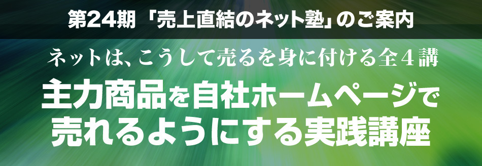 どの企業にもネット販売の売上増大策だけでなくネットを活用することにより事業にとっていかにプラスになる仕組みを構築するのかという視点で指導をしてきました。参加者からは、「ネット塾に参加してから自社のネットに対する取組み、考え、そして、売上と社内が変わった」とコンサルタントにとって最も嬉しい評価をいただいています。景気が良くなるかどうかは判りません。しかし、景気を嘆いてみても何も解決しません。こんな時こそ「我社に足りないものは何か?」を、考えて行動しないといけないと思うのです。ネット活用もその中の一つです。ネット活用は、避けることができない必須の経営項目です。ですから、いち早くネット活用のための基本ノウハウを身に付け実践ください。社長の強い意志により、自社なりのネット活用法を構築してください。