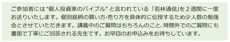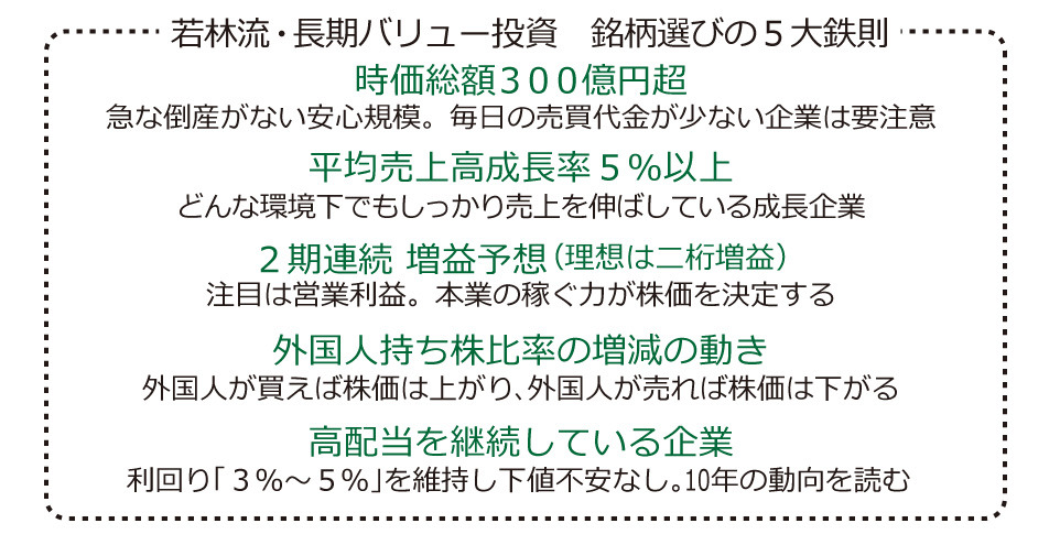 日本人の顔をした外国人投資家 若林 利明 (わかばやし としあき) 投資経験39年。フィデリティ投信・クレデイスイス投信・三菱UFJ投信など、米国系・欧州系・日系の大手運用会社で数千億円規模の運用を任され、独自の分析手法と先見力で、抜群の収益を上げ続ける。特に、欧米の企業年金からは〝若林に一任する〟とまで言われ、絶大な信頼を獲得。「日本人の顔をした外国人投資家」と呼ばれ、世界のトップファンドマネージャーに。 06年個人投資家として独立。日本個人投資家協会日本株式講座担当講師。公認会計士の資格を持ち、財務分析能力抜群。上場企業の社外監査役を歴任。若林リサーチ代表。