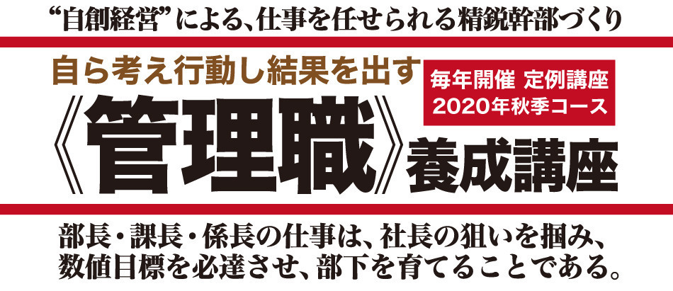 社長が「コレやれ」「アレやれ」と言い、管理職が単に指示に従うだけで、業績があがる時代ではなくなりました。時代が大きく変化している今、会社に必要なことは、環境変化に柔軟に対応し、自ら考え結果を出す精鋭幹部の育成です。会社の命運は、社長の意図を汲み、自部門の目標を達成できる管理職の数をどれだけ揃えられるかで決まります。