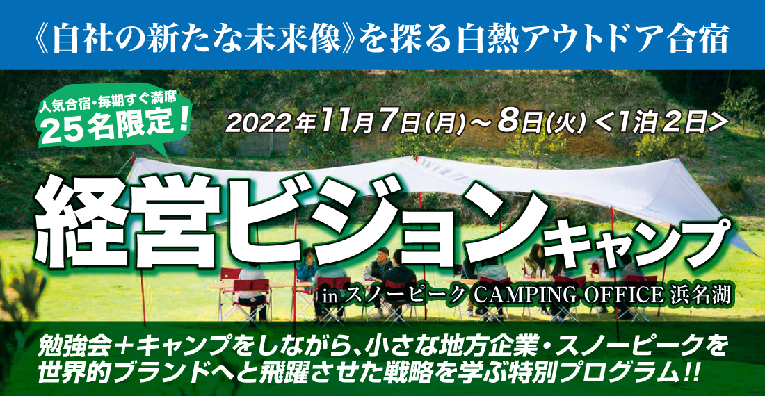 スノーピークが世界中のキャンパーを熱狂させる魅力は、同社が磨き上げた「存在戦略」から生まれている。自社だからできることは何なのか。自社だからできることは何なのか。徹底的にトガらせたスノーピークの存在価値が、社員も顧客も魅了し、社長が描く未来へ一丸となって突き進む原動力の一つとなっている。本会では、「在戦戦略」の考案者である国見氏に、その構築法をレクチャーいただく。