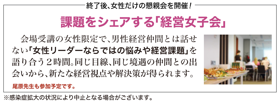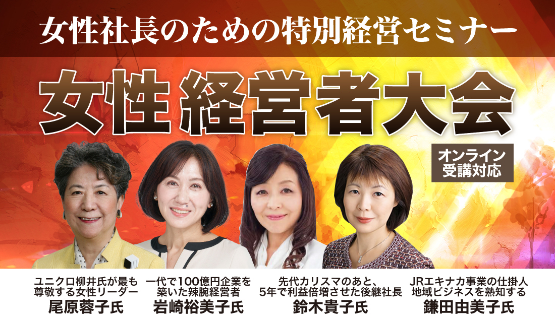 女性経営者はもちろん、女性役員・幹部の方、女性後継者のご参加を強くお勧めいたします。