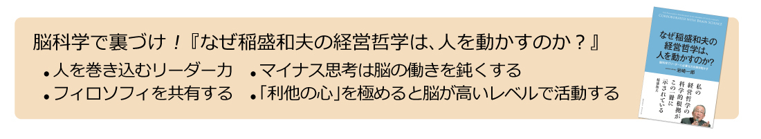著書『なぜ稲盛和夫の経営哲学は、人を動かすのか?』は稲盛氏本人から「私の経営哲学の科学的根拠がこの一冊に示されている」と言われたほど高い評価を得ている。経営哲学と脳科学を掛け合わせた指導は、他の脳科学者と一線を画す。
