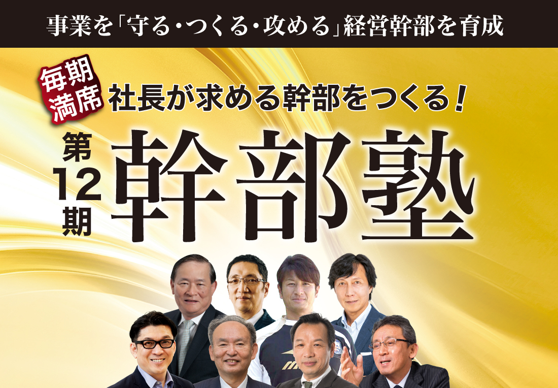 本塾は、現役幹部および次世代幹部に「既存事業を守る」幹部の実務、「未来をつくる」幹部の実務、自社の「足りないところを補い、攻める」幹部の実務…という幹部の経営3大スキルを身につける特別講座である。