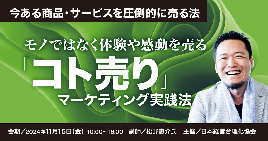 「モノ売りからコト売りへ」を軸に一部上場企業から商店街の個店まで1600社以上の業績向上に貢献。売上アップや集客アップはもとより、マーケティングからブランディングまで幅広く支援。商店街や温泉地など、地域の活性化にも意欲的に取り組み、実績も多数。特に、打ち手が難しい満杯市場や縮小市場への支援を得意とする実力コンサルタント。氏が指導する「コト売り」の手法は、「お客様に喜ばれるだけでなく、社員の思考と行動レベルが上がるうえに、しっかりと利益が出る」と多くの経営者に喜ばれている。本会でお教えする「コト売り経営」の成功プロセスは、20年以上の試行錯誤を経て、あらゆる業種業態で成果が出るよう確立されている。ぜひあなたの経営の参考にしてください。