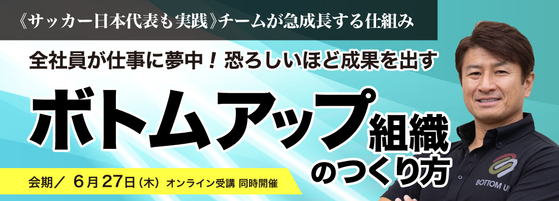 ボトムアップ組織は、サッカー日本代表も実践しています。あなたの会社でも実践すれば、日本代表が優勝を目指すのと同じような気持ちで、全社員が全力で働きます。