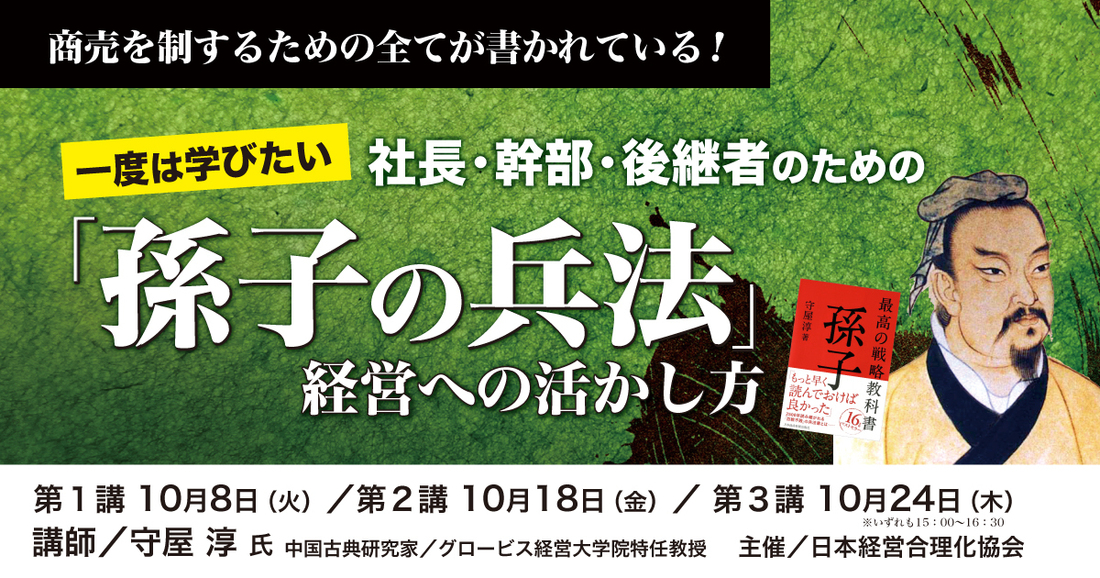 そこで本会は、数ある孫子の教えの中から「商売を制する孫子の戦い方」、「孫子に学ぶ商売繁盛の絶対法則」、「組織を自在に動かす孫子の人心掌握術」など、実際に経営で使える実務を厳選して1コマ90分×3回コースで指導いただきます。