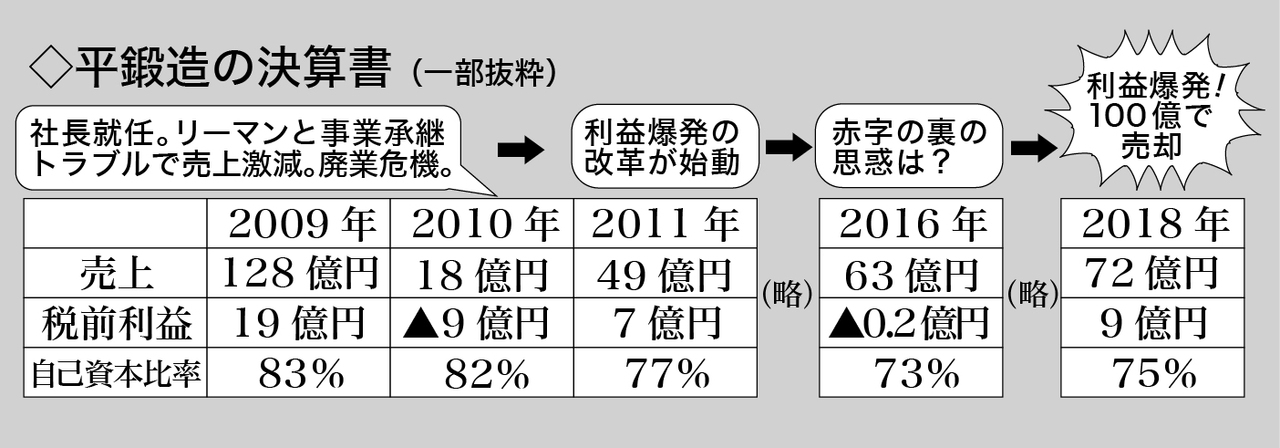 1977年、父・昭七が設立した平鍛造株式会社に入社。父の天才的な技術で製造される超大型鍛造リングにより、他の追随を許さない企業として急成長を遂げる。しかし、リーマン・ショックによる景気悪化などにより受注量が激減。型破りな父による強引な客先交渉が裏目に出て、2009年に廃業する事態に。会社存続の危機に追い込まれる中、同年、代表取締役社長に就任。数々の経営の合理化を進め、数年で業績を回復させる。2021年、大手企業へ株式を100%譲渡し、完全子会社化。