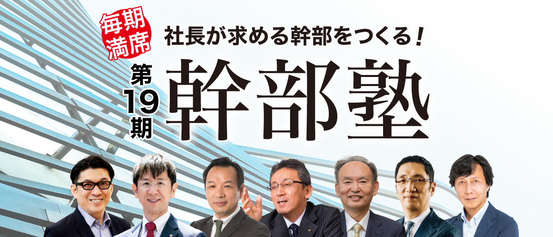 本塾は、現役幹部および次世代幹部に「既存事業を守る」幹部の実務、「未来をつくる」幹部の実務、自社の「足りないところを補い、攻める」幹部の実務…という幹部の経営3大スキルを身につける特別講座である。