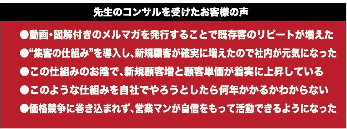 中でも、SEO対策やインターネット広告を駆使した安定的に売上アップ・資料請求・お問い合わせなどを可能にする「集客の仕組み化」は当代随一と言われている。コンサル歴18年、指導企業300余社で業績アップに携わり「日本の専門コンサルタント年鑑2017・2018」ジャパンタイムズ「アジアの次世代リーダー100」に掲載されるなど注目の実力コンサルタントである。BtoB・BtoCの垣根なく指導。