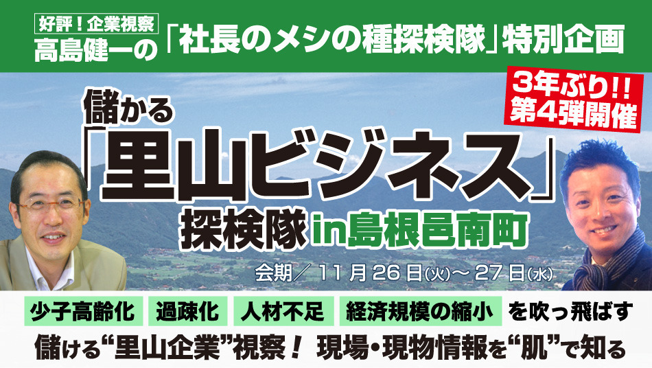 そこで今回の社長のメシの種探検隊は、島根県邑南町を訪れ、地方しかも里山でもがっちり儲ける企業を2日間に渡り訪問。現場、現物から儲けのヒミツに迫ります。人口減の市場でも元気なお手本企業から、明日の儲けの種を掴んでください。